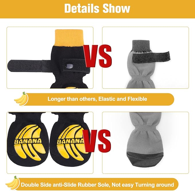- 🍌Non-Skid: For hardwood floor, if your baby has problems who was splaying and keeps slipping on your wooden floors with back legs, we suggest you would buy these the soles which have anti-slip adhesive, which can provide extra traction. Besides, wearing a non skid sock prevents dogs from licking and irritating the wound further aid in healing foot wounds.⚠️Please note we have design patent to protective this exclusive design!