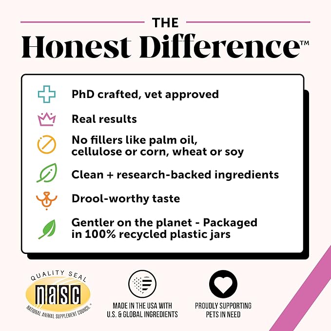 - Made in the U.S.A. | NASC member company: All Pet Honesty products are made in the US with US and globally sourced ingredients and are produced in a GMP-compliant facility that meets the highest safety standards so you can rest assured you're giving your pet the best quality product possible! Pet Honesty is also a NASC member company meaning it’s met the highest quality and compliance standards for pet supplements.