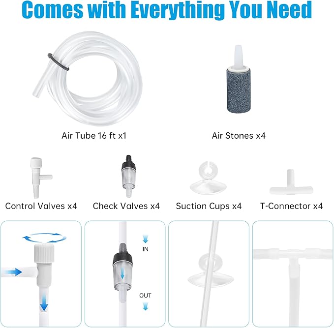 - Comes with Everything Needed: 1 x 4-outlet Air Pump, 1 x 16ft Airline Tubing, 4 x Air Stones, 4 x Check Valves, 4 x Suction Cups, 4 x Control Valves, 4 x T-Connectors