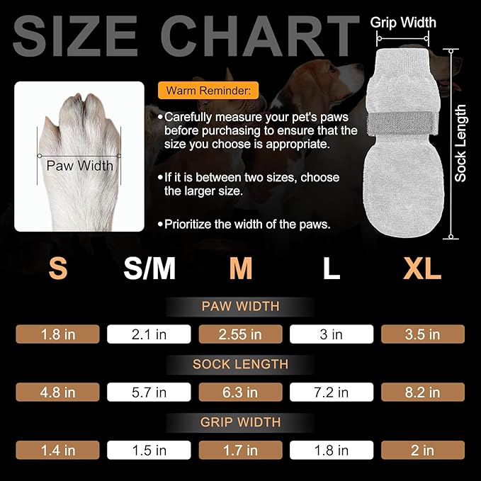 - Size Small: Length 4.4" Paw width 1.8" Grip width 1.4".Please measure your pet before purchase, if your size is between the two sizes, it's better to choose the smaller size. Because our pet paw protector socks are fabrics with elasticity. (Measurement method: let your dog step on a piece of paper and draw the outline of the paw. Measure the width of the claw and choose size. Note: make sure your dog is on paper instead of putting your paws on the paper at will.)