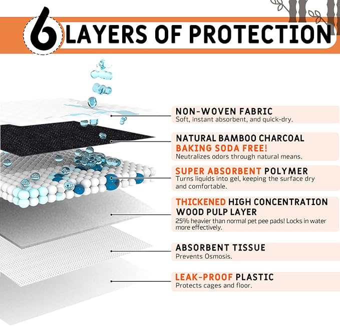 - Dry Surface with Moisture Wicked Away- With an instant absorbent surface, a thickened high concentration wood pulp layer(25% heavier than normal pee pads!) to absorb liquids, and a polymer core to turn the absorbed liquids into gel instantaneously to lock in water, this cage liner will diminish the moisture that can potentially spread and keep the surface dry for a whole day.