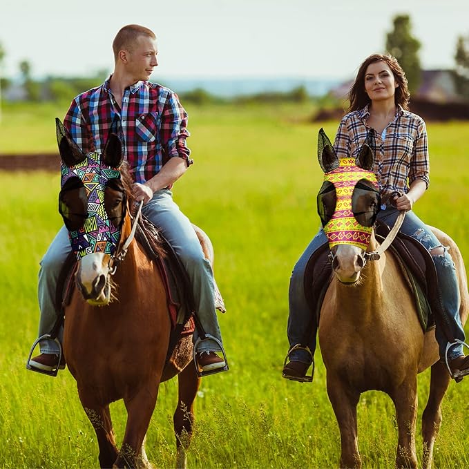 Frienda 4 Pieces Horse Fly Masks with Ears Face Covering UV Protection from Insect Pests Elasticity Smooth Comfortable Mesh Horse Mask Accessories(Geometric,Medium)