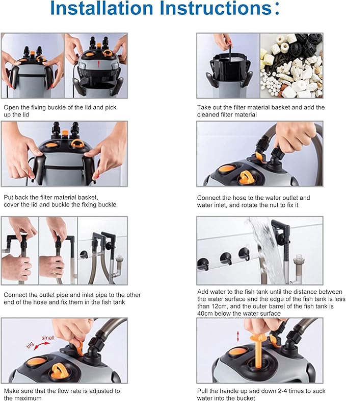 - Filter Foam pads screen out dirt and debris. Fills filter chamber with water for self-priming system startup. Please refer to the 6th main picture for the operation guide, the last main picture for operation precautions. If you find any problems in the process of operating the machine, please feel free to contact us, 24 hours online service for you!