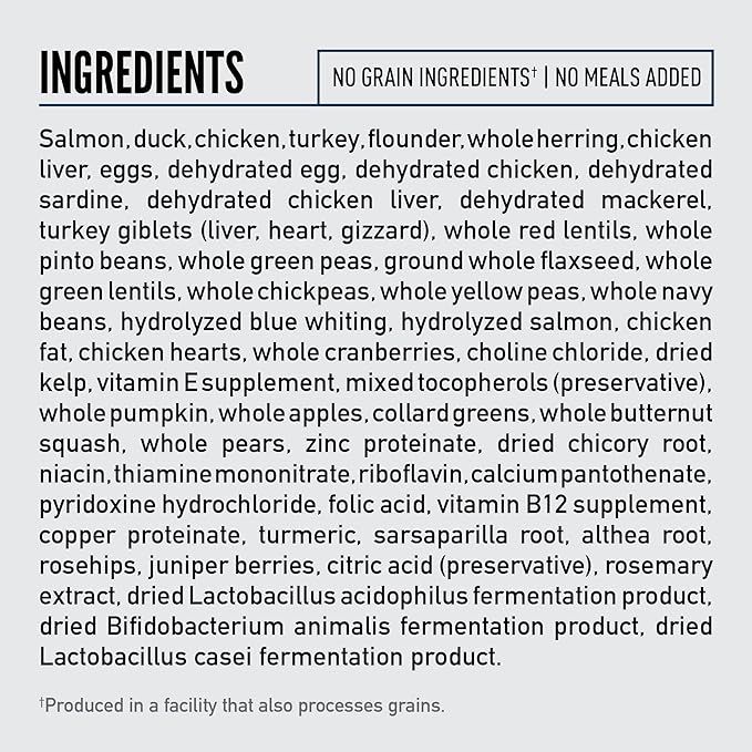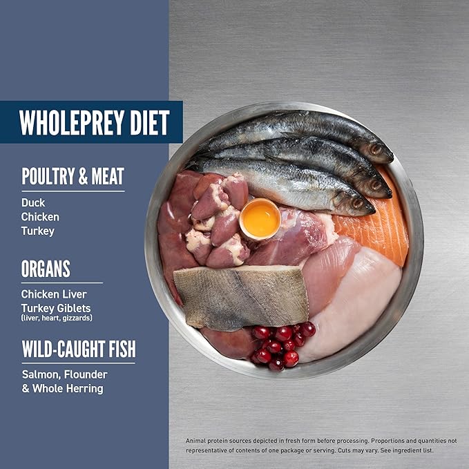 - Grain free dry cat food containing up to 90 percent** premium animal ingredients, including WholePrey ingredients like bones and organs to mimic what your cat's ancestors consumed in the wild