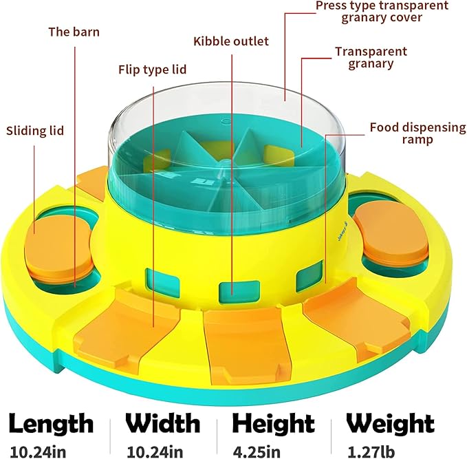 - đŸăEasy to UseăDog puzzle toys have 6 flip type lids, you can add food to the granary, pets press down on the transparent lid, food will fall into the leaky food-box. Pets also can eat food by moving 2 sliding lids.