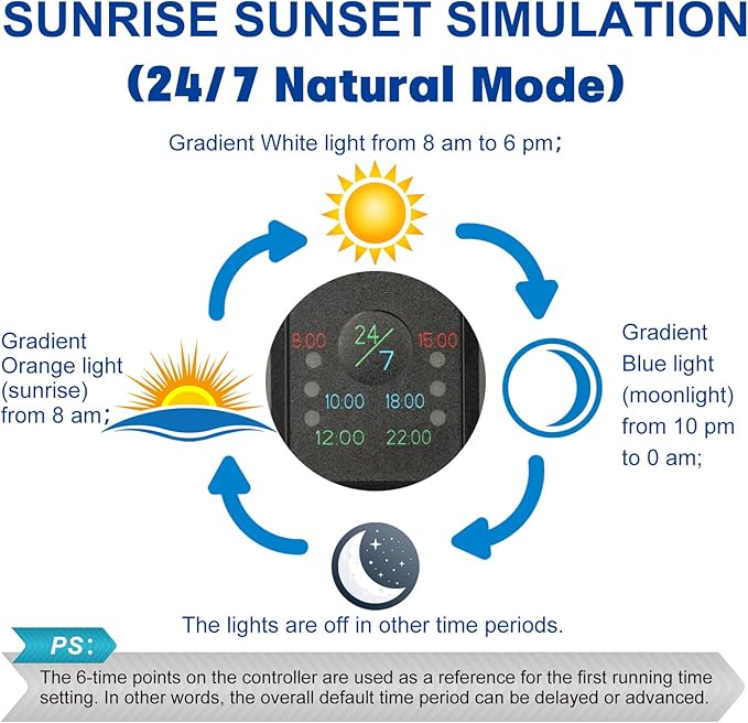 - 24/7 Preprogrammed Setting:"Set once and never touch anything again". This mode of aquarium light will free your hands and never be borthed by daily settings. The fish tank light comes on with a faint orange light as if sunsrise and graduates brighter in the day and dulls down and turns blue around 10:00. This natural living conditions will promote the vitality of your fishes and ensures optimum plant growth.