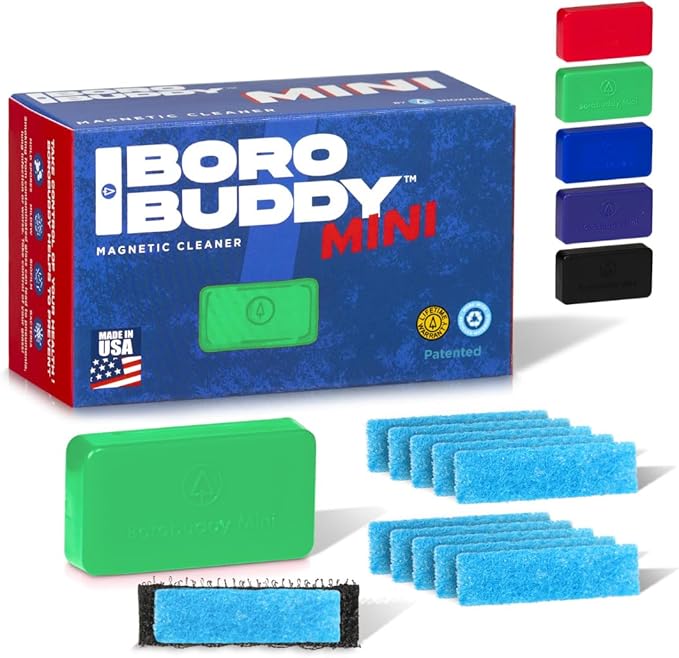 - ✅ COMPACT SIZE - We revolutionized glass cleaning with the original BoroBuddy Pro magnetic glass cleaner. Now we've created a compact version that can fit harder to reach places, grooves and smaller glass pieces. The SnowTree BoroBuddy mini handle measures 1.5" x 1" with an inside cleaning surface of 1" across. Includes 11 replacement cleaning pads.