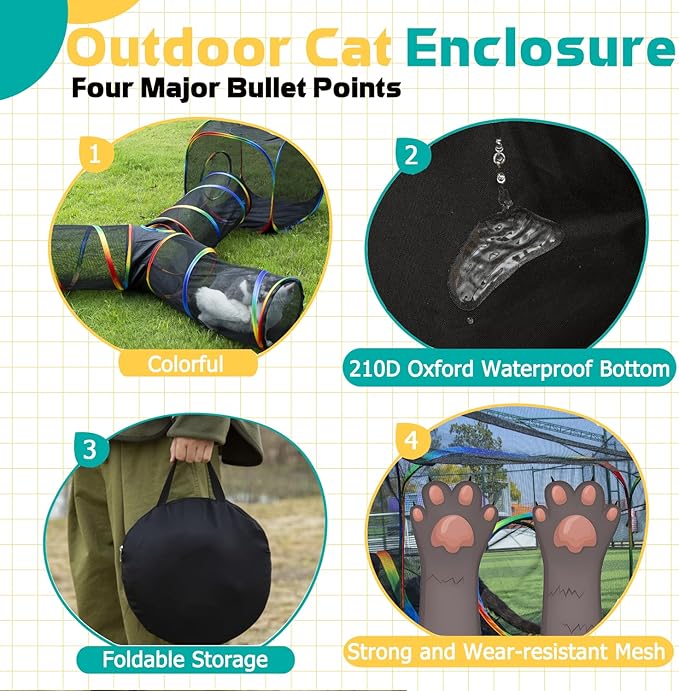 - 🐱Easy to Clean and Storage- The cube and tunnel were made by mesh and waterproof oxford. they are easy clean-up. And there is lightweight & poratable design storage bag for travel. Perfect for your backyard or even your porch, balcony, or deck.