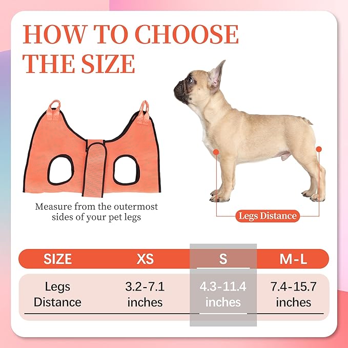 - Choose the Right Size: Our pet grooming hammock comes in three sizes: XS, S, and L. 𝐁𝐞𝐟𝐨𝐫𝐞 𝐩𝐮𝐫𝐜𝐡𝐚𝐬𝐢𝐧𝐠, 𝐲𝐨𝐮 𝐡𝐚𝐯𝐞 𝐭𝐨 𝐦𝐞𝐚𝐬𝐮𝐫𝐞 𝐭𝐡𝐞 𝐝𝐢𝐬𝐭𝐚𝐧𝐜𝐞 𝐛𝐞𝐭𝐰𝐞𝐞𝐧 𝐲𝐨𝐮𝐫 𝐩𝐞𝐭'𝐬 𝐟𝐫𝐨𝐧𝐭 𝐚𝐧𝐝 𝐛𝐚𝐜𝐤 𝐥𝐞𝐠𝐬. 𝐓𝐡𝐞𝐧 𝐚𝐜𝐜𝐨𝐫𝐝𝐢𝐧𝐠 𝐭𝐨 𝐭𝐡𝐞 𝐬𝐢𝐳𝐞 𝐜𝐡𝐚𝐫𝐭, 𝐲𝐨𝐮 𝐜𝐚𝐧 𝐜𝐡𝐨𝐨𝐬𝐞 𝐭𝐡𝐞 𝐦𝐨𝐬𝐭 𝐬𝐮𝐢𝐭𝐚𝐛𝐥𝐞 𝐡𝐚𝐦𝐦𝐨𝐜𝐤 𝐟𝐨𝐫 𝐲𝐨𝐮𝐫 𝐩𝐞𝐭