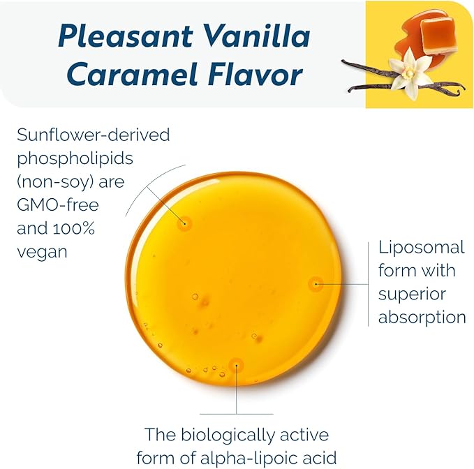 - Vanilla Caramel Flavor - Each serving contains 1500mg of liquid Vitamin C and 70mg of R-Lipoic Acid in a natural, non-GMO, liposomal preparation.