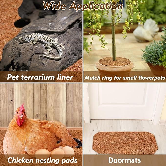 - 🌴【Wide Application】: Reptile terrarium liners can be used for many kinds of reptiles, like turtles, snakes, lizards, chameleon, bearded dragon, Iguana, insects etc. As to the coco mat is square, so you can cut it into round coco mulch disc rings for protect or decorate small flowerpots. It is also a good choice for chicken nesting box liners