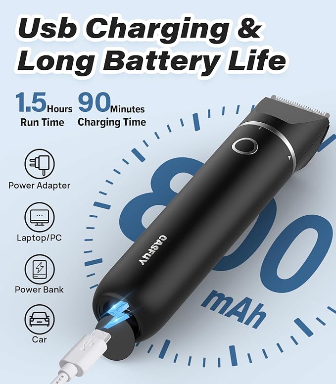 - 【USB Charging】- With built-in rechargeable lithium battery , the dog grooming clipper can be used for 1.5 hours after being re-charged for 90 minutes by phone adapter, computer, power bank, etc. USB charging cable is provided, not the power adapter.