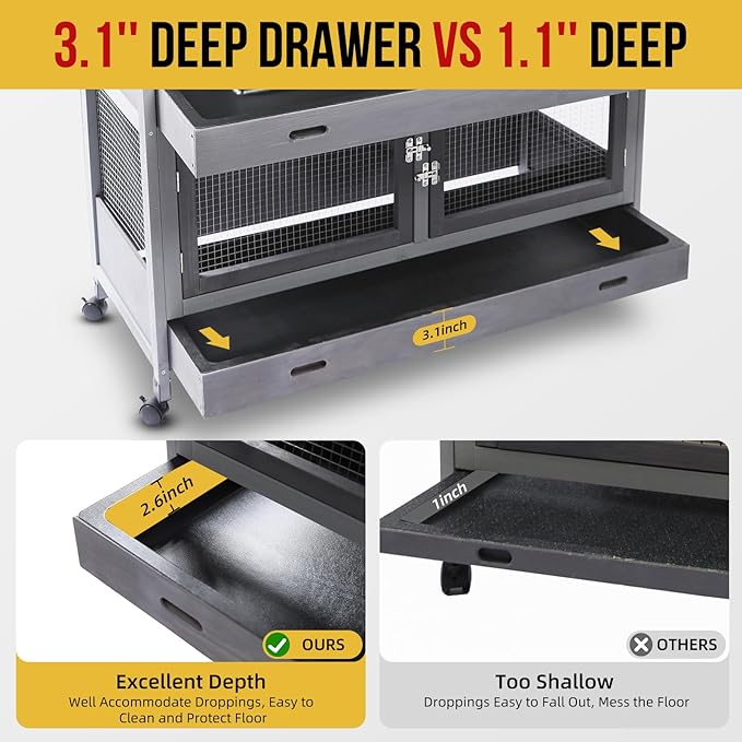 - 【Roomy Space & Easy Cleaning】Double levels (39.5" L*16.9" W of each) up to 9.2ft² in total, this rabbit hutch provides sufficient space for 2 small to mid size of bunnies to live. 2 pull out trays (2.6'' deep of each) made of hard plastic with wooden supports slide in and out for easy cleaning