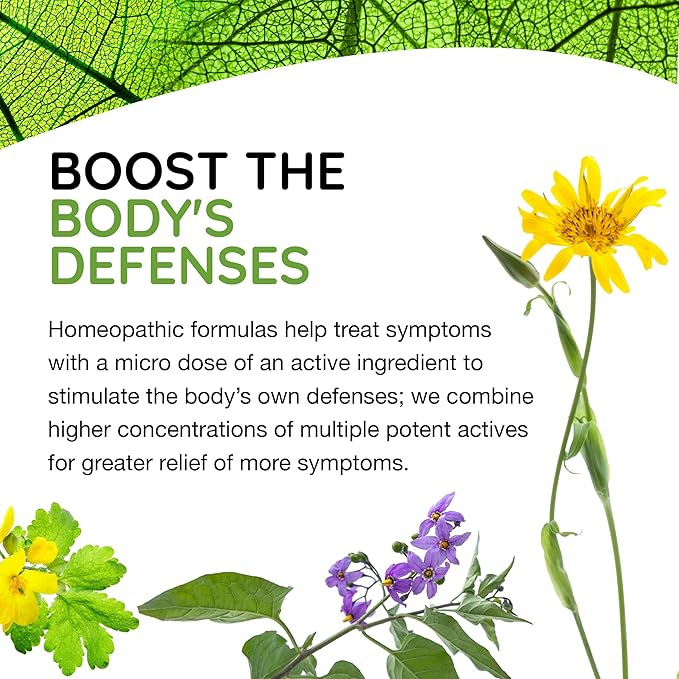 - BOOST THE BODY'S DEFENSES - Homeopathic formulas address symptoms with a micro dose of an active ingredient to stimulate the body’s own defenses; we combine multiple potent actives in multiple concentrations for greater relief of more symptoms.