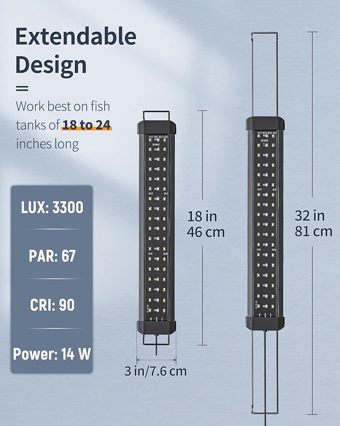 - For 18" to 24" Tanks: With an extendable bracket (min length: up to 18"; max length: up to 32"), the LED aquarium light always stays steady on the fish tank. Work best on tanks of 18 to 24 inches long.