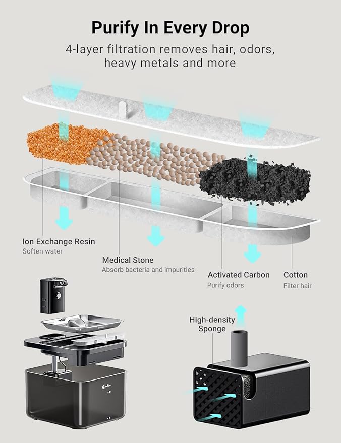 - Enjoy Every Sip of Fresh Water - The 5-level filtration system continuously provides fresh and healthy water to your pets. 1.Activated carbon removes bad taste and odor 2.Ion exchange resin could soften the tap water 3.Medical stone removes heavy metals and releases trace elements 4.Non-woven fabric could filter hair and impurities 5.The high-density sponge of pump helps remove fine particles
