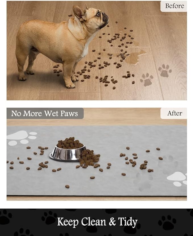 - Keep Clean & No Stains:No marks will be left when food and water are dropped on the dog food mat. Unlike traditional silicone pet feeding mats, our pet feeding mat for food and water won't pick up pet hair or dust, and won't build up tough-to-clean limescale, keeping the dog bowl mat as good as new forever.
