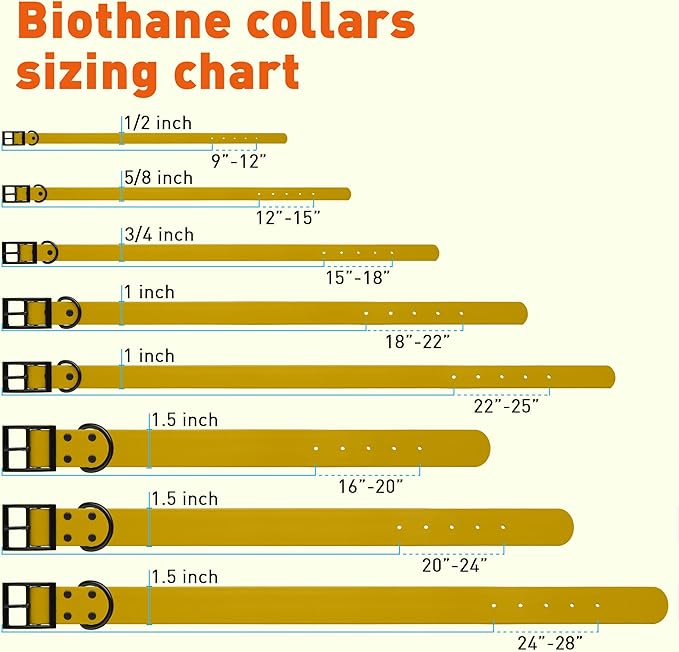 - Accommodates all breeds and dog sizes, with 8 lengths and 5 widths to select from. Widths from 0.5" to 1.5" and lengths from 9" up to 28" offer a collar to fit small, medium, large and giant dog breeds.