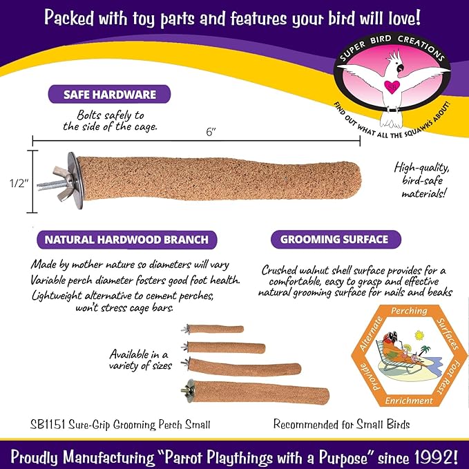 - IDEAL FOR SMALL BIRDS: Crafted for birds like Parrotlets, Parakeets, Cockatiels, Lovebirds, and similarly sized birds.The Super Bird Creations Sure-Grip Grooming Perch provides a stable, comfortable, and natural grooming surface.