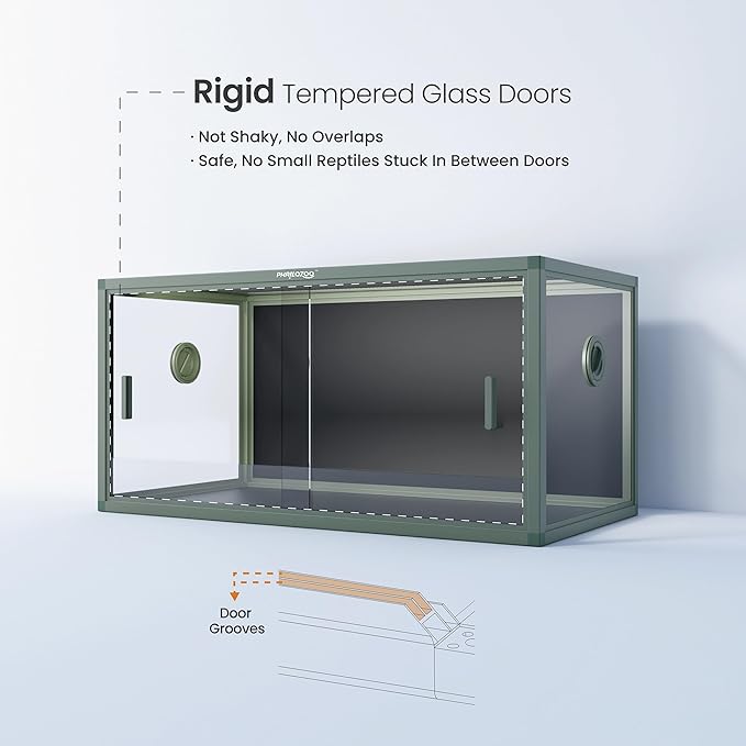 - 【Easy Maintenance】Front opening reptile terrarium with door handles included for easy cleaning & feeding. No more suction cup problems or unsightly fingerprints all over. The substrate barrier keeps the substrate in place. Our tempered glass doors are durable enough to withstand scratching.