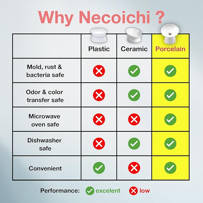 - Our first tilted bowl is joining Necoichi’s Raised Food Bowl lineup! Food stays centered, and the tilted lip makes it easier for your cat to eat without whisker or neck fatigue from the perfect height.