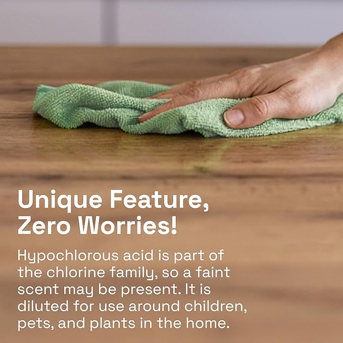 - Unique Feature: Hypochlorous acid is a part of the chlorine family, so there may be a faint scent. The hypochlorous acid is diluted for use around the home with children, pets, and plants