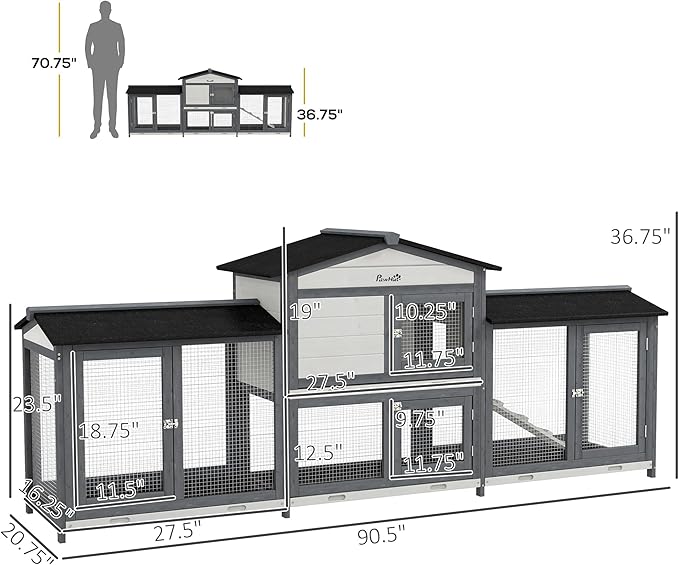 - Rabbit House Information: Overall Dimensions: 90.5" L x 20.75" W x 36.75" H, Living House Dimensions: 29.25" L x 18" W x 19.75" H. Suitable for 2-4 rabbits. Assembly required.