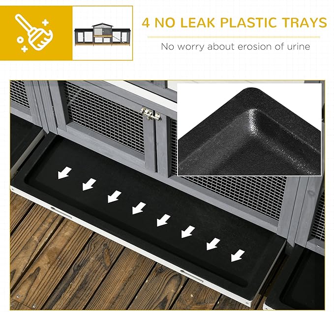 - Easy to Clean: The main house and each run box of this rabbit hutch outdoor have built-in slide-out trays underneath, making cleaning this hutch super-easy.