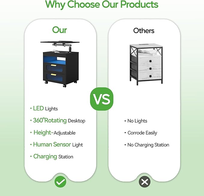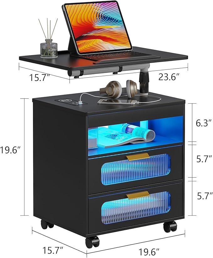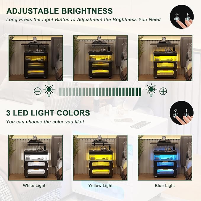 - ✅【Large Capacity Space】 The led nightstand provides spacious storage for nighttime essentials. There is a swivel desk; Open storage shelves; 2 drawers,The desktop can hold everyday items and keep them within reach.
