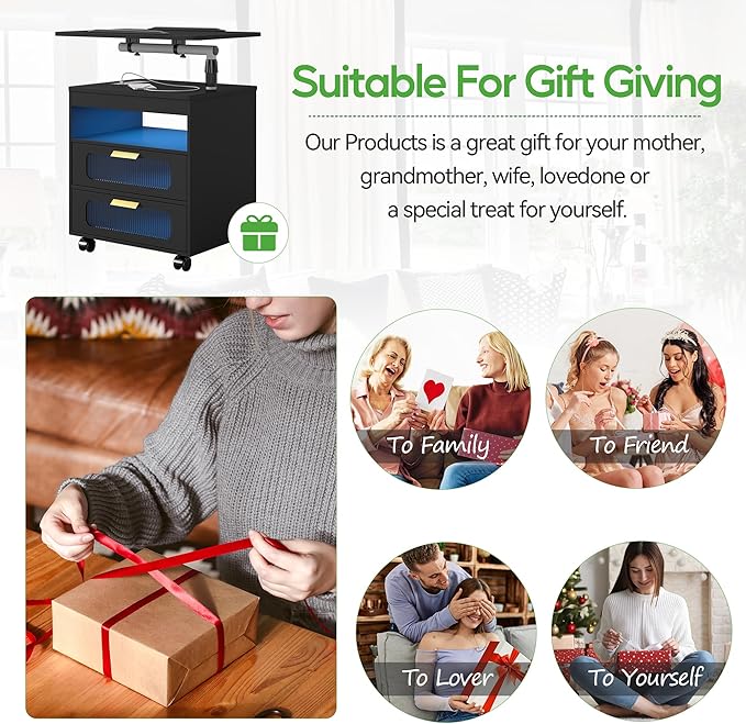 HNEBC Nightstand with Wireless Charging Station, LED Nightstand Has Adjustable Rotary Workstation,Smart Night Stand with 2 Drawers,Modern Bedside Table for Bedroom, Sensor Light/Wheel (Black)