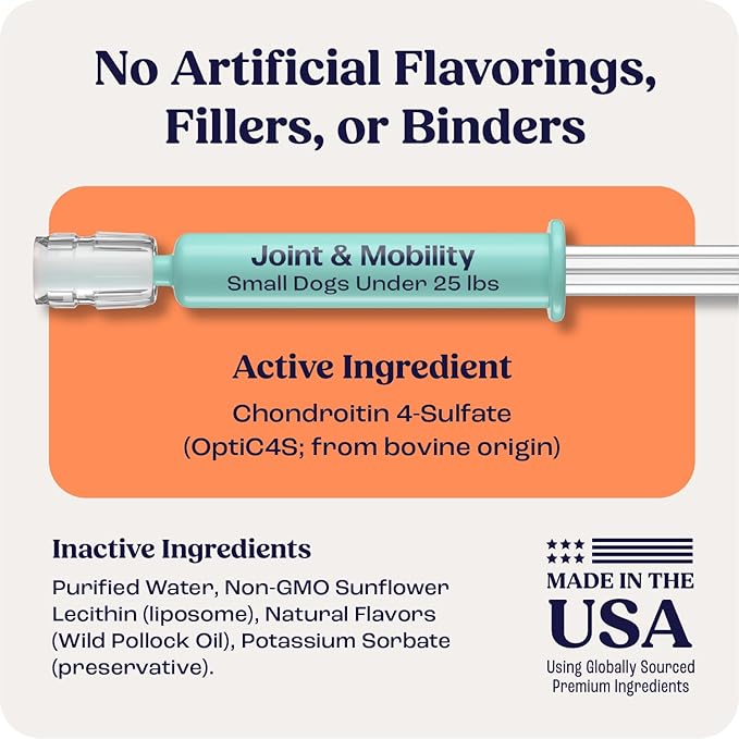 - EASY-FEED WEEKLY DOSES FOR MAXIMUM RESULTS: Our drug-free ingredients are safe for long-term use. Start your pet’s joint health journey with 2 boxes for the first month. Box #1: Administer 1 liquid dose every 4 days for 4 doses. Box #2: Maintain joint health with one dose per week.