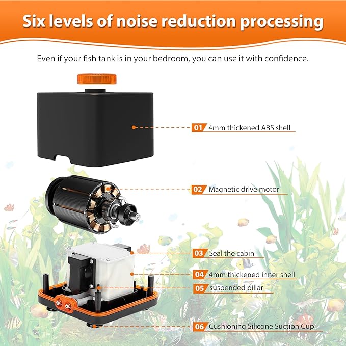 - Bedroom level mute effect: Bearingless motor works through magnetic bearings to reduce friction and thereby reduce noise. Four rubber feet reduce the contact between the motor and the casing, thereby reducing the transmission path of noise. The four suction cups firmly fix the air pump and provide sound insulation and shock absorption to achieve noise reduction. Even when used in the bedroom, it will not feel noisy