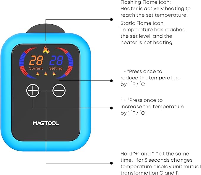 - 【Precision Adjustable, Multiple Safety Measures】MagTool aquarium heater offers a wide temperature adjustment range, from 59°F to 93°F, with a built-in high-precision temperature sensor that intelligently stops heating once the set temperature is reached. This prevents overheating and eliminates the risk of "cooking" the fish. The water-off protection feature further enhances safety.
