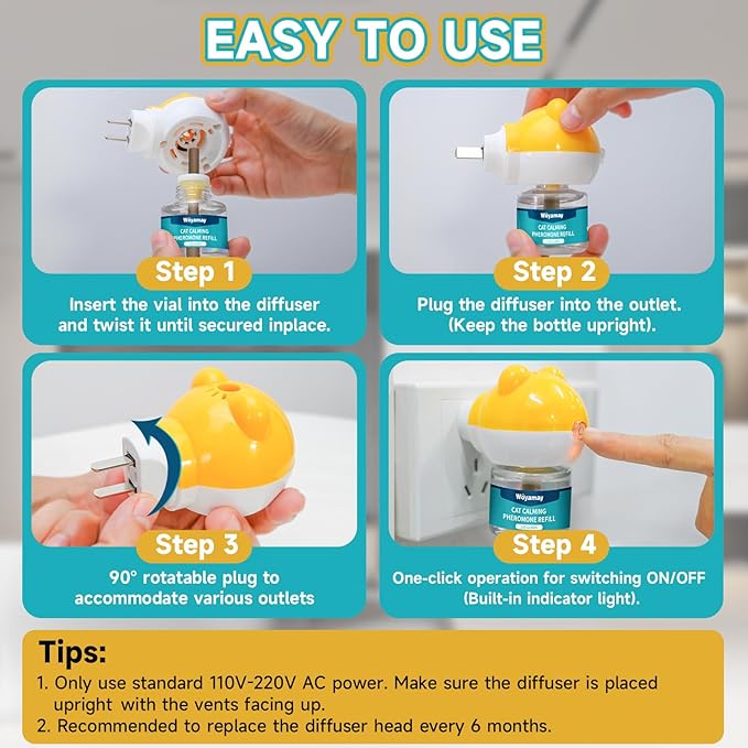 - Fast-Acting: Most cats show improved behavior within 2 weeks of using our calm cat diffuser, effectively alleviating various stressors such as vet visits, traffic, travel, separation anxiety, heat, loneliness, fireworks, thunderstorms, and noise issues. It can effectively soothe cats.