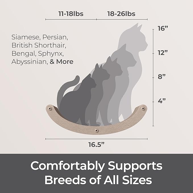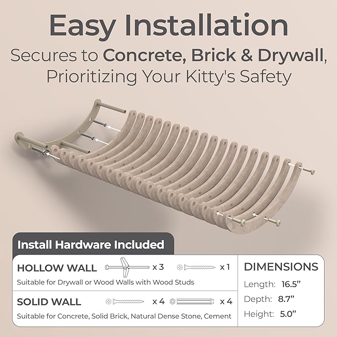 - Effortless Paradise: This cat hammock and wall bed includes all installation hardware, allowing your fur-baby to start exploring right away. Our cat climbing shelf securely attaches to concrete, cement, brick, dry wall and more ensuring your cat’s safety.