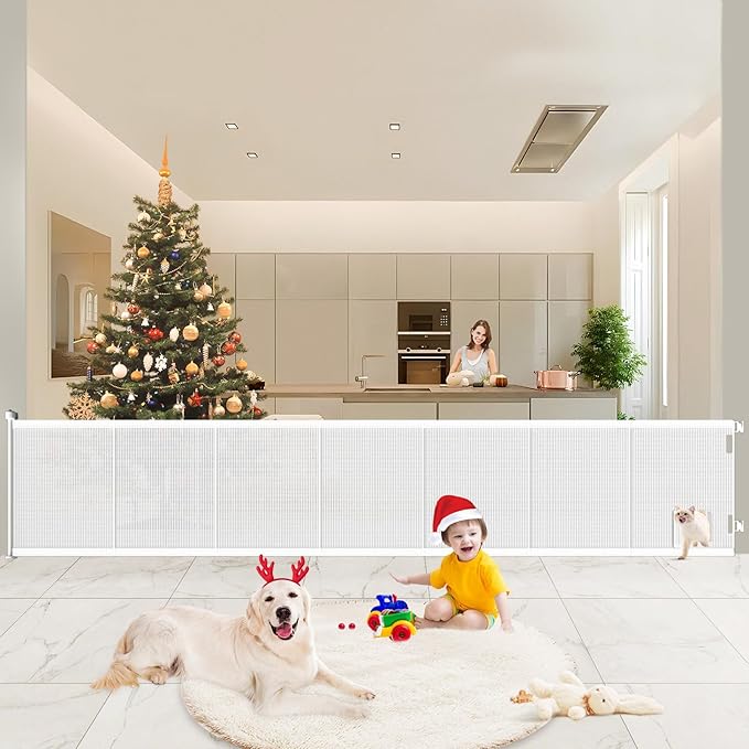 - 120" Extra Wide Retractable Design: Extend our retractable baby gate up to 120" wide, with 41" heightened gates preventing pets from jumping out. Designed to save space, this dog gate is convenient when needed and easily tucked away out of sight when not in use. Note: Please ensure the installation height is above 41" before purchasing