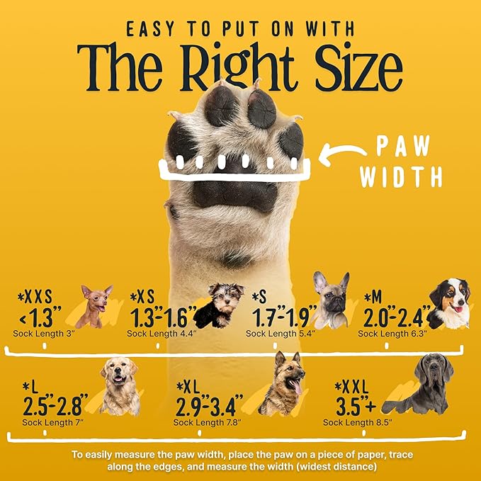 - XL Size: 2.9" - 3.4" paw width. Please make sure to measure your pet while they are standing with weight on paw. Includes 4 dog grip socks made of elastic cotton nylon fabric that stretches.