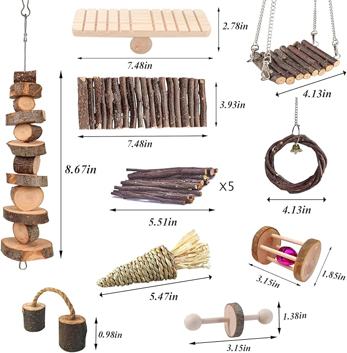 - 【10 Modles of Chew Toys】The hamster toys set includes Seesaw, wooden ladder bridge, apple branch Molar string,unicycle,grass carrot toy,Bell Roller,apple wood sticks, apples wood dumbbell,apple wood hammock,apple wood ring swing. Great enrichment set for hamster,guinea pig,chinchilla.Rat cage accessories are a great way to provide your rats with fun and stimulating toys to enhance their environment.