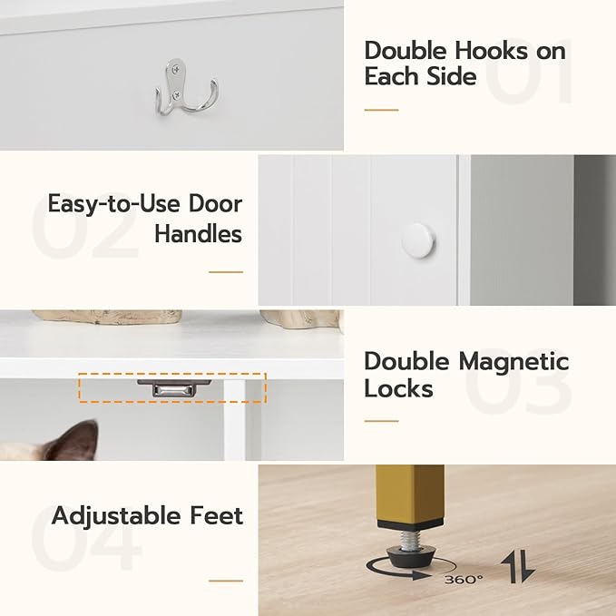 - Stylish Appearance: Classic white-gold color scheme and unique grooved doors endow the dog proof litter box enclosure with elegant and appealing tone, which is eye-catching and easily fits into any home decor