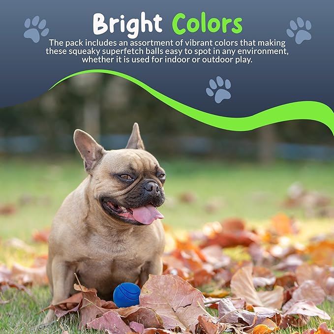 - ๐ข Pack Includes - 6 X Durable Squeaky SuperFetch Balls for Dogs in 6 colors ! Each chew toys measures 1.5 Inch in diameter and comes with a white mesh net bag for easy storage.