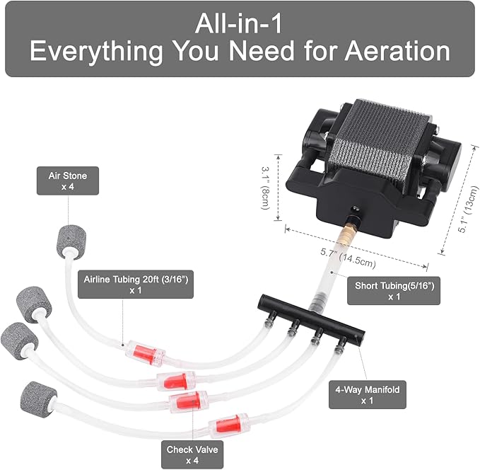 - ALL-IN-ONE PACKAGE - This aerator pump includes everything you need for effective water aeration, including a 4-outlet manifold, check valves, airline tubing, and air stones.