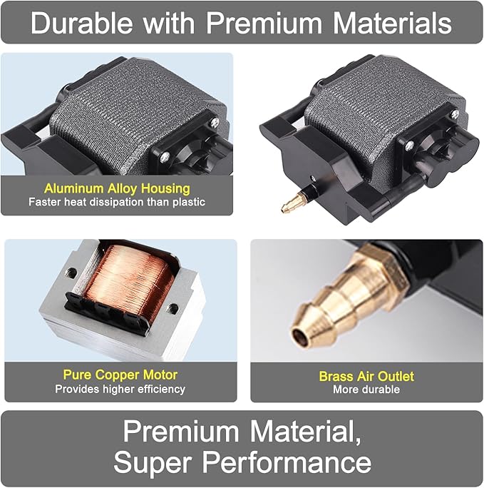 - VERSATILE APPLICATIONS - Suitable for various uses, this fish air pump can be utilized as an aquarium air pump, koi pond aerator, hydroponics air pump, septic air pump, air assist for laser cutting, or compost tea brewing pump.