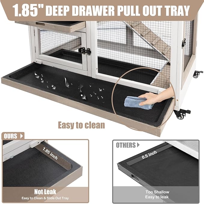 - 【EASY TO MOVE & CLEAN WITH LOCKABLE WHEELS】The rabbit cage includes four lockable metal wheels for smooth indoor/outdoor mobility. A deep plastic tray at the base prevents leaks and makes this bunny cage easy to clean and maintain.