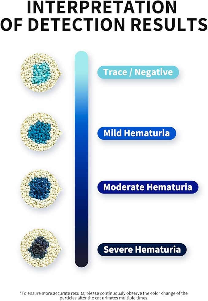 - PETKIT 2024 new mixed cat litter, which changes colors to help monitor your cat’s urine to detect potential illness for your cats early. The test particles will change color in 3 seconds when exposing to colorless trace blood in cat's urine, and maintain the color for 7 days, which can remind you of your cat's health.