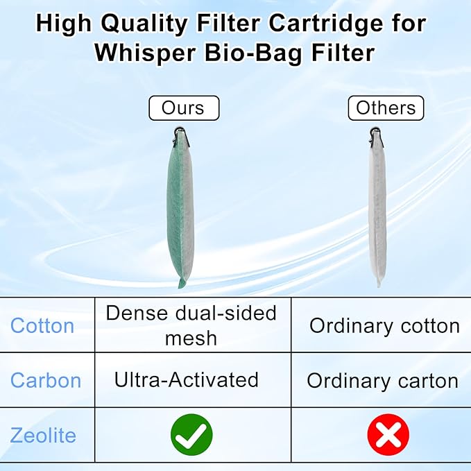 - The Four-Stage Filtration Help Keep the Water Crystal Clear and Healthy: The filter cartridges compatible with filter is made of dense dual-sided mesh, Better thickness provides better filtration, over 40g ultra-activated carbon and also add processed zeolite, which can effectively filter and absorb impurities to keep the clean water source and provide the healthy growth environment for fish