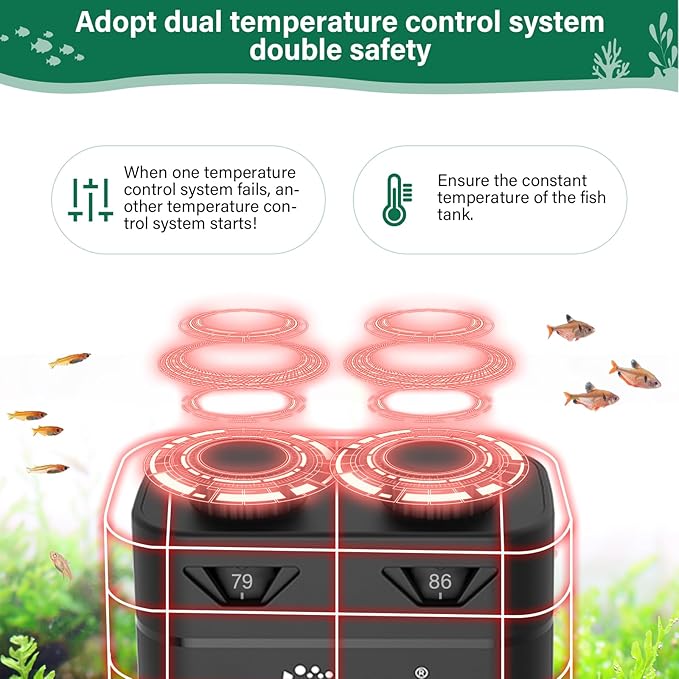 - 1 Dual temperature control system: one chip with two independent heating systems. When the temperature control system of one heating rod fails, the temperature control system of the other rod can continue to work, reducing the occurrence of frozen fish in the fish tank caused by damage to the heating rod, and ensuring the constant temperature of the fish tank