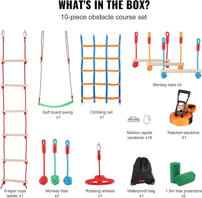 VEVOR Ninja Warrior Obstacle Course for Kids, 1 x 50 ft Weatherproof Slacklines, 500lbs Weight Capacity Monkey Line, Outdoor Playset Equipment, Backyard Toys Training Equipment Set with 10 Obstacles