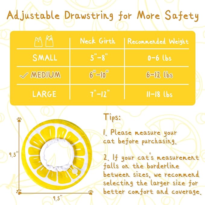 - 【SUITABLE FOR ALL SIZE OF CATS】 Soft cone for cats has an adjustable inner, so you can make a comfortable fit for your cat. By adjusting the stretchy string, cat won’t slip out of it that easily. Available in two sizes. Size M (9.5"×9.5"×2.2") suitable for cats with a neck circumference of 6-10 inches (7-18 pounds cats recommended).