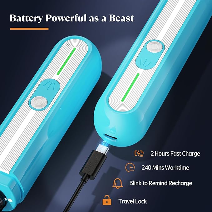 - 𝘼 𝙛𝙪𝙡𝙡 𝙘𝙝𝙖𝙧𝙜𝙚 𝙧𝙪𝙣𝙨 𝙛𝙤𝙧 240 𝙢𝙞𝙣𝙨: which qualifies for months of dog nail filing usually. You would never find yourself halfway through a nail trim when suddenly it dies. Also the charge indicator keeps you informed of the battery status at a glance, allowing you to recharge timely