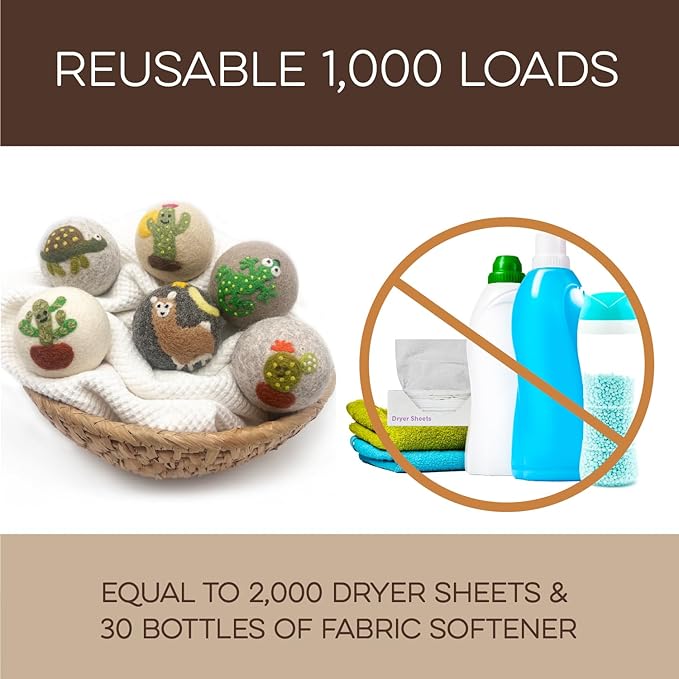 - REUSABLE FOR 1000+ LOADS – REDUCE WASTE: Why keep buying disposable dryer sheets? These cute dryer balls last 1000+ loads, replacing 2000 dryer sheets or 30 bottles of fabric softener. Fluff Ewes dryer wool balls laundry reusable deliver a cost-effective solution for 2-4 years of hassle-free laundry. Make a smarter choice for your wallet and the environment.